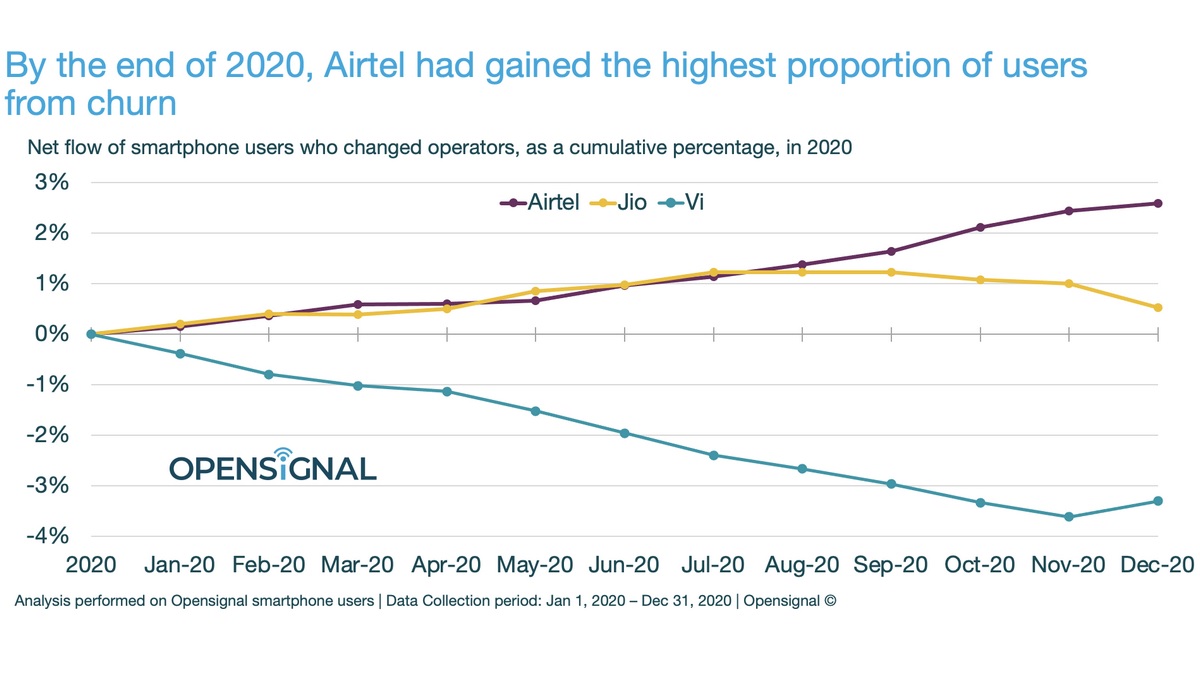 Airtel gained the highest number of subscribers due to better network quality by the end of 2020. The Latest data from Open signal, an independent global mobile analytics company, shows Airtel and Jio gained new subscribers by the end of 2020 but Vi (Vodafone Idea) lost subscribers to churn. Open signal also stated that while Airtel continued to steadily gain subscribers throughout the year, Jio's intake of new subscribers gradually flattened. Vi, on the other hand, was steadily losing subscribers from the beginning of last year.